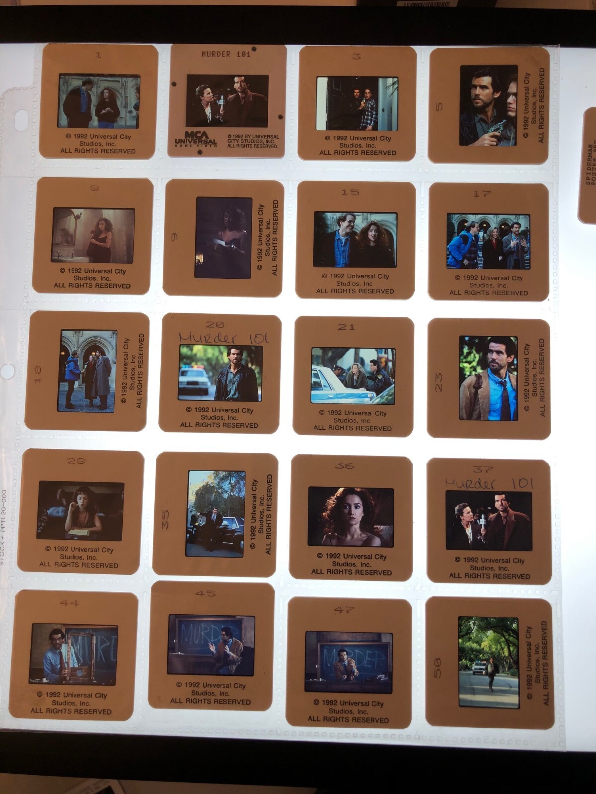 Murder 101 Pierce Brosnan ,Dey Young and Kim Thompson 1991 thriller Collection Lot x 20 Original 35mm Transparency Slides in stamped mounts. This listing is for all 20 35mm Transparency Slides in a lot/collection.. This is a real collectors item and would make superb quality photographs or prints. This would also be a great addition to any collection or image archive. The transparency is in excellent condition. This collectors item is being sold from one collector to another, no rights are given or implied. Silver Screen Archives are gradually releasing from their vast archives thousands of original photographs, transparencies, negatives, slides, lobby cards and other movie or television memorabilia. Listing and template services provided by inkFrog