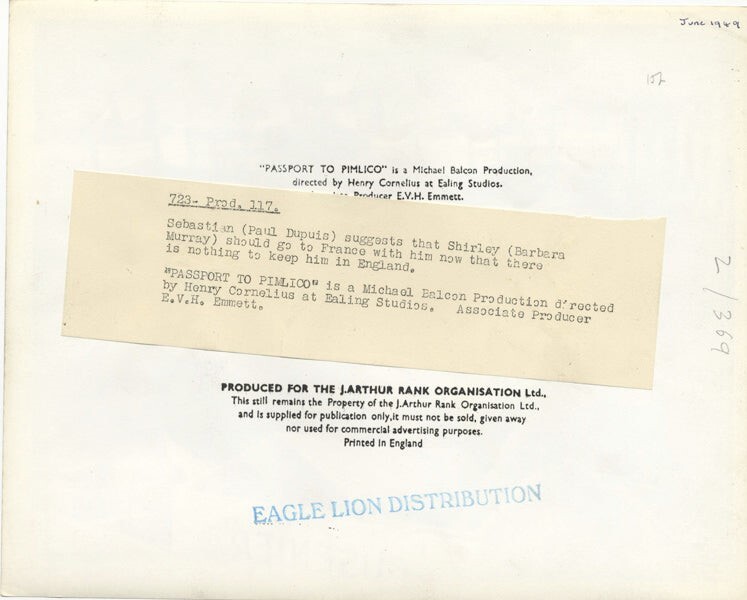 Passport to Pimlico Barbara Murray Paul Dupuis Original 8x10 Photo Stamped with Snipe 1949 VG/Near Mint Condition This item is an ORIGINAL 8x10 photo from the historic archives of Silver Screen Mementos. This original photograph was made in the actual year the film, television show or event was produced. The movie studios produced publicity photographs for distribution to the press, photo agencies and publicity departments to advertise the film/tv show or event. Very often original photos have press release information on the reverse of the photo - movie credits, description of the scene, event and people involved. This is a historic piece of cinema art and is being offered from one collector to another, no rights given or implied. Silver Screen are gradually releasing thousands of Original Photographs, Transparencies, Negatives, Lobby Cards, Posters, Magazines and other memorabilia from our historic archive.