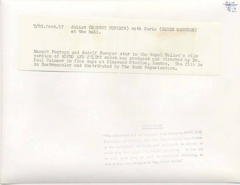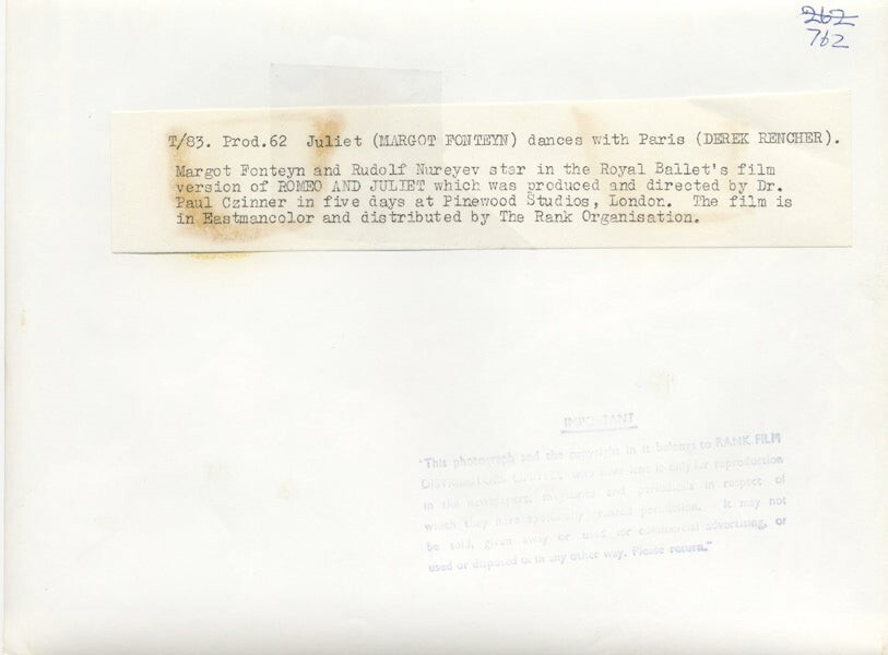 Romeo and Juliet Margot Fonteyn Derek Rencher Royal Ballet Original 8x10 Photo 1966 Stamped with paper caption snipe VG Condition This item is an ORIGINAL 8x10 photo from the historic archives of Silver Screen Mementos. This original photograph was made in the actual year the film, television show or event was produced. The movie studios produced publicity photographs for distribution to the press, photo agencies and publicity departments to advertise the film/tv show or event. Very often original photos have press release information on the reverse of the photo - movie credits, description of the scene, event and people involved. This is a historic piece of cinema art and is being offered from one collector to another, no rights given or implied. Silver Screen are gradually releasing thousands of Original Photographs, Transparencies, Negatives, Lobby Cards, Posters, Magazines and other memorabilia from our historic archive.