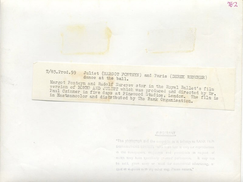 Romeo and Juliet Margot Fonteyn Derek Rencher Royal Ballet Original 8x10 Photo with paper caption snipe VG Condition This item is an ORIGINAL 8x10 photo from the historic archives of Silver Screen Mementos. This original photograph was made in the actual year the film, television show or event was produced. The movie studios produced publicity photographs for distribution to the press, photo agencies and publicity departments to advertise the film/tv show or event. Very often original photos have press release information on the reverse of the photo - movie credits, description of the scene, event and people involved. This is a historic piece of cinema art and is being offered from one collector to another, no rights given or implied. Silver Screen are gradually releasing thousands of Original Photographs, Transparencies, Negatives, Lobby Cards, Posters, Magazines and other memorabilia from our historic archive.