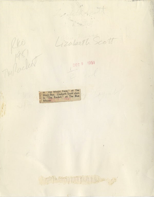 Lizabeth Scott The Racket Film Noir Glamour Pin up Original 7x9 Photo with Snipe 1951 VG/Near Mint Condition This item is an ORIGINAL 8x10 photo from the historic archives of Silver Screen Mementos. This original photograph was made in the actual year the film, television show or event was produced. The movie studios produced publicity photographs for distribution to the press, photo agencies and publicity departments to advertise the film/tv show or event. Very often original photos have press release information on the reverse of the photo - movie credits, description of the scene, event and people involved. This is a historic piece of cinema art and is being offered from one collector to another, no rights given or implied. Silver Screen are gradually releasing thousands of Original Photographs, Transparencies, Negatives, Lobby Cards, Posters, Magazines and other memorabilia from our historic archive.