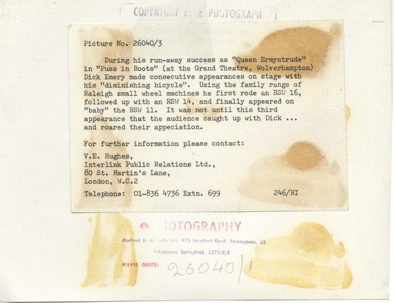 Dick Emery Queen Erymntrude Puss in Boots Pantomine Original 7x9 Photo with paper caption snipe This item is an ORIGINAL 8x10 photo from the historic archives of Silver Screen Mementos. This original photograph was made in the actual year the film, television show or event was produced. The movie studios produced publicity photographs for distribution to the press, photo agencies and publicity departments to advertise the film/tv show or event. Very often original photos have press release information on the reverse of the photo - movie credits, description of the scene, event and people involved. This is a historic piece of cinema art and is being offered from one collector to another, no rights given or implied. Silver Screen are gradually releasing thousands of Original Photographs, Transparencies, Negatives, Lobby Cards, Posters, Magazines and other memorabilia from our historic archive.