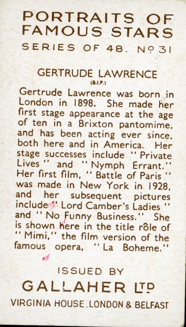 Gertrude Lawrence Vintage original Gallaher Cigarette Trading Card 1930's Rare in Near Mint Condition This is a vintage original cigarette card that was issued by the Tobacco company to promote their brand of cigarettes. These were inserted into the cigarette packets and have become collectors items. Silver Screen are gradually releasing thousands of Original Photographs, Transparencies, Negatives, Lobby Cards, Posters, Magazines and other memorabilia from our historic archive.