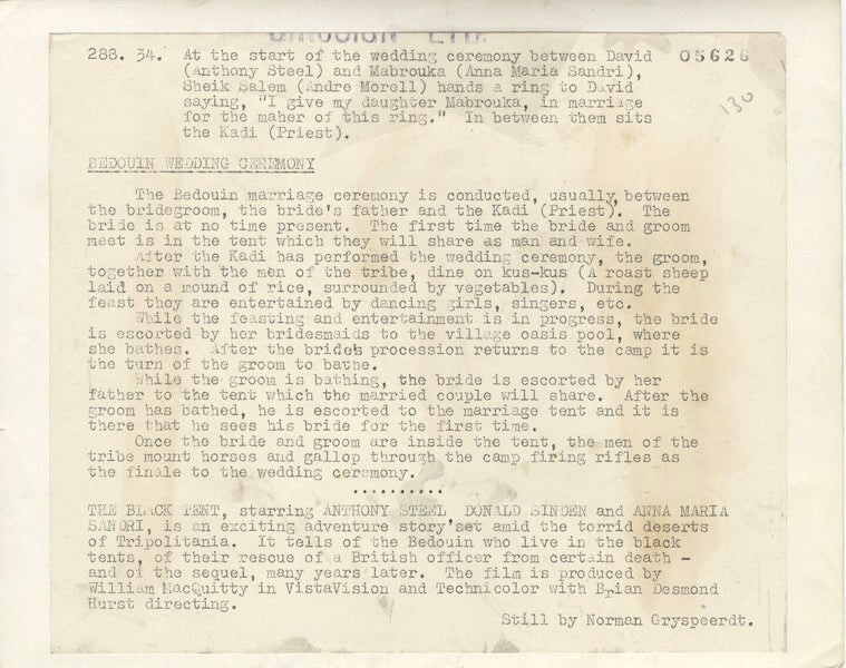 The Black Tent Donald Sinden, Anna Maria Sandri Bedouin Original 7x9 Photo with Snipe 1956 VG/Near Mint Condition This item is an ORIGINAL 8x10 photo from the historic archives of Silver Screen Mementos. This original photograph was made in the actual year the film, television show or event was produced. The movie studios produced publicity photographs for distribution to the press, photo agencies and publicity departments to advertise the film/tv show or event. Very often original photos have press release information on the reverse of the photo - movie credits, description of the scene, event and people involved. This is a historic piece of cinema art and is being offered from one collector to another, no rights given or implied. Silver Screen are gradually releasing thousands of Original Photographs, Transparencies, Negatives, Lobby Cards, Posters, Magazines and other memorabilia from our historic archive.