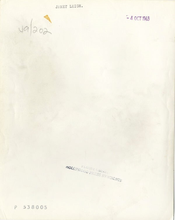 Janet Leigh Striking 1965 Studio Glamour Portrait Original 8x10 Photo Stamped VG Condition (border trim) This item is an ORIGINAL 8x10 photo from the historic archives of Silver Screen Mementos. This original photograph was made in the actual year the film, television show or event was produced. The movie studios produced publicity photographs for distribution to the press, photo agencies and publicity departments to advertise the film/tv show or event. Very often original photos have press release information on the reverse of the photo - movie credits, description of the scene, event and people involved. This is a historic piece of cinema art and is being offered from one collector to another, no rights given or implied. Silver Screen are gradually releasing thousands of Original Photographs, Transparencies, Negatives, Lobby Cards, Posters, Magazines and other memorabilia from our historic archive.