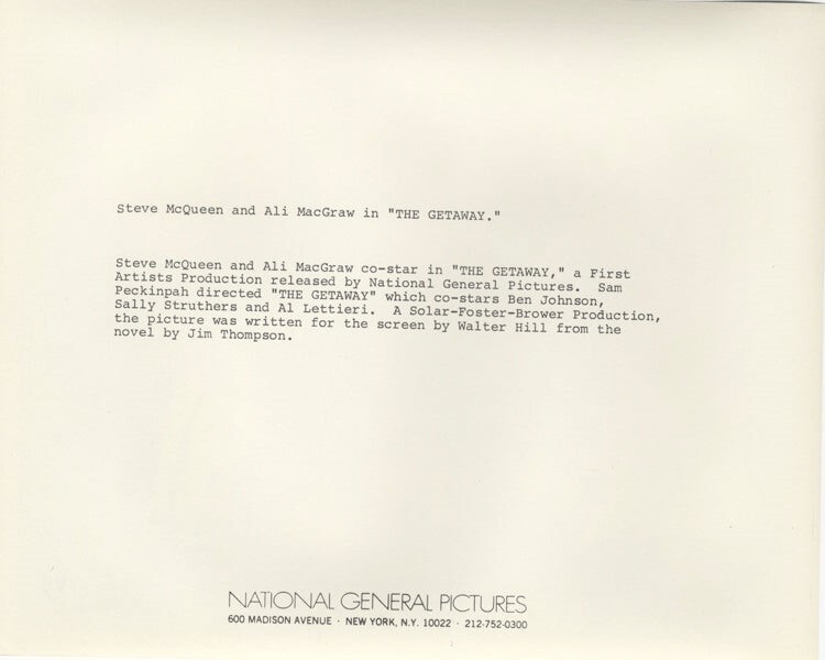 The Getaway Ali MacGraw underwear wet hair Steve McQueen Original 8x10 Photo 1972 Sam Peckinpah classic thriller stamped on back VG/Near Mint This item is an ORIGINAL 8x10 photo from the historic archives of Silver Screen Mementos. This original photograph was made in the actual year the film, television show or event was produced. The movie studios produced publicity photographs for distribution to the press, photo agencies and publicity departments to advertise the film/tv show or event. Very often original photos have press release information on the reverse of the photo - movie credits, description of the scene, event and people involved. This is a historic piece of cinema art and is being offered from one collector to another, no rights given or implied. Silver Screen are gradually releasing thousands of Original Photographs, Transparencies, Negatives, Lobby Cards, Posters, Magazines and other memorabilia from our historic archive.