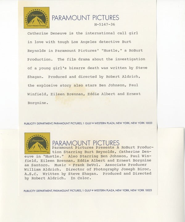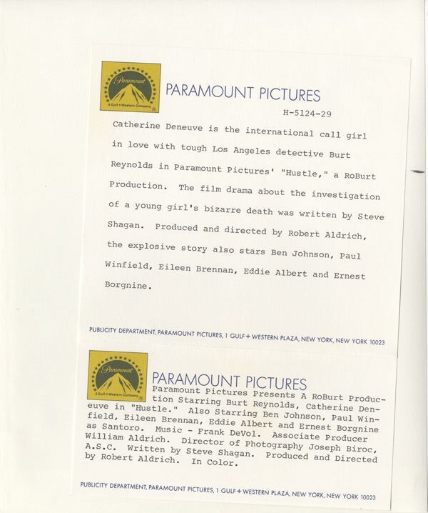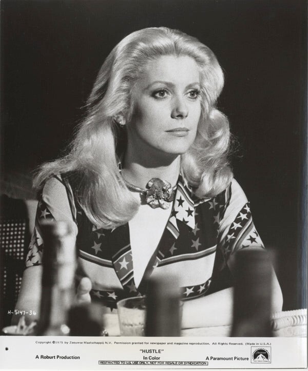 Catherine Deneuve Hustle Striking Glamour Portrait Original 8x10 Photo with Snipe 1975 Near Mint Condition This item is an ORIGINAL 8x10 photo from the historic archives of Silver Screen Mementos. This original photograph was made in the actual year the film, television show or event was produced. The movie studios produced publicity photographs for distribution to the press, photo agencies and publicity departments to advertise the film/tv show or event. Very often original photos have press release information on the reverse of the photo - movie credits, description of the scene, event and people involved. This is a historic piece of cinema art and is being offered from one collector to another, no rights given or implied. Silver Screen are gradually releasing thousands of Original Photographs, Transparencies, Negatives, Lobby Cards, Posters, Magazines and other memorabilia from our historic archive.