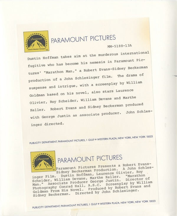 Marathon Man Dustin Hoffman pointing gun Original 8x10 Photo 1976 with paper caption snipe VG/Near Mint Condition This item is an ORIGINAL 8x10 photo from the historic archives of Silver Screen Mementos. This original photograph was made in the actual year the film, television show or event was produced. The movie studios produced publicity photographs for distribution to the press, photo agencies and publicity departments to advertise the film/tv show or event. Very often original photos have press release information on the reverse of the photo - movie credits, description of the scene, event and people involved. This is a historic piece of cinema art and is being offered from one collector to another, no rights given or implied. Silver Screen are gradually releasing thousands of Original Photographs, Transparencies, Negatives, Lobby Cards, Posters, Magazines and other memorabilia from our historic archive.
