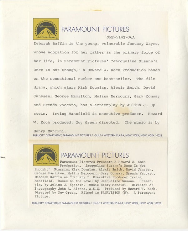 Deborah Raffin Once is Not Enough Smiling Portrait Original 8x10 Photo with Snipe 1974 VG/Near Mint Condition This item is an ORIGINAL 8x10 photo from the historic archives of Silver Screen Mementos. This original photograph was made in the actual year the film, television show or event was produced. The movie studios produced publicity photographs for distribution to the press, photo agencies and publicity departments to advertise the film/tv show or event. Very often original photos have press release information on the reverse of the photo - movie credits, description of the scene, event and people involved. This is a historic piece of cinema art and is being offered from one collector to another, no rights given or implied. Silver Screen are gradually releasing thousands of Original Photographs, Transparencies, Negatives, Lobby Cards, Posters, Magazines and other memorabilia from our historic archive.
