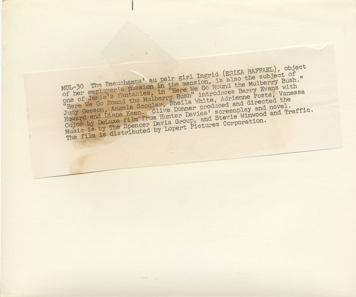 Erika Raffael Here We Go Round the Mulberry Bush Original 8x10 approx Photo 1968 with Snipe VG Condition (border trimmed) This item is an ORIGINAL 8x10 photo from the historic archives of Silver Screen Mementos. This original photograph was made in the actual year the film, television show or event was produced. The movie studios produced publicity photographs for distribution to the press, photo agencies and publicity departments to advertise the film/tv show or event. Very often original photos have press release information on the reverse of the photo - movie credits, description of the scene, event and people involved. This is a historic piece of cinema art and is being offered from one collector to another, no rights given or implied. Silver Screen are gradually releasing thousands of Original Photographs, Transparencies, Negatives, Lobby Cards, Posters, Magazines and other memorabilia from our historic archive.