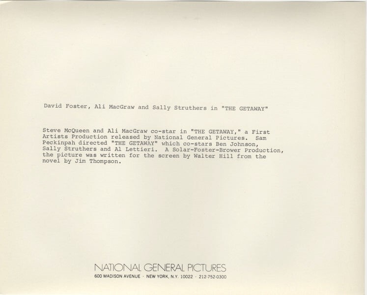 The Getaway 1972 Sam Peckinpah Sally Struthers Ali MacGraw Original 8x10 Photo rare behind teh scenes with snipe on back VG/Near Mint Condition This item is an ORIGINAL 8x10 photo from the historic archives of Silver Screen Mementos. This original photograph was made in the actual year the film, television show or event was produced. The movie studios produced publicity photographs for distribution to the press, photo agencies and publicity departments to advertise the film/tv show or event. Very often original photos have press release information on the reverse of the photo - movie credits, description of the scene, event and people involved. This is a historic piece of cinema art and is being offered from one collector to another, no rights given or implied. Silver Screen are gradually releasing thousands of Original Photographs, Transparencies, Negatives, Lobby Cards, Posters, Magazines and other memorabilia from our historic archive.