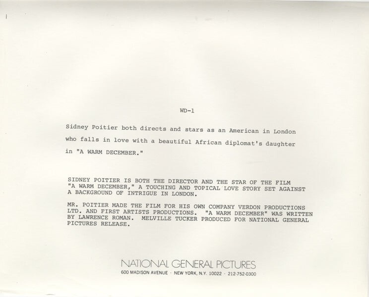 Sidney Poitier A Warm December Portrait Original 8x10 Photo 1973 Stamped with Snipe VG/Near Mint Condition This item is an ORIGINAL 8x10 photo from the historic archives of Silver Screen Mementos. This original photograph was made in the actual year the film, television show or event was produced. The movie studios produced publicity photographs for distribution to the press, photo agencies and publicity departments to advertise the film/tv show or event. Very often original photos have press release information on the reverse of the photo - movie credits, description of the scene, event and people involved. This is a historic piece of cinema art and is being offered from one collector to another, no rights given or implied. Silver Screen are gradually releasing thousands of Original Photographs, Transparencies, Negatives, Lobby Cards, Posters, Magazines and other memorabilia from our historic archive.