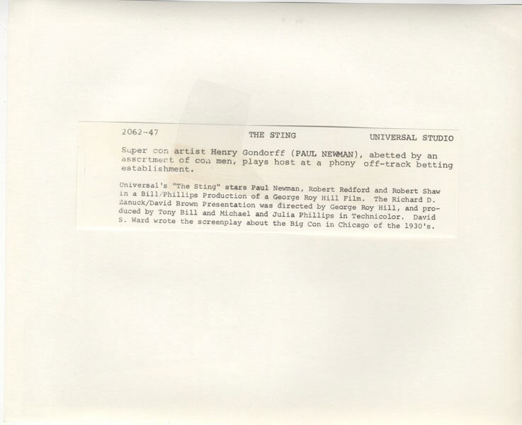 The Sting Paul Newman and con men in betting shop Original 8x10 Photo 1973 VG/Near Mint Condition This item is an ORIGINAL 8x10 photo from the historic archives of Silver Screen Mementos. This original photograph was made in the actual year the film, television show or event was produced. The movie studios produced publicity photographs for distribution to the press, photo agencies and publicity departments to advertise the film/tv show or event. Very often original photos have press release information on the reverse of the photo - movie credits, description of the scene, event and people involved. This is a historic piece of cinema art and is being offered from one collector to another, no rights given or implied. Silver Screen are gradually releasing thousands of Original Photographs, Transparencies, Negatives, Lobby Cards, Posters, Magazines and other memorabilia from our historic archive.