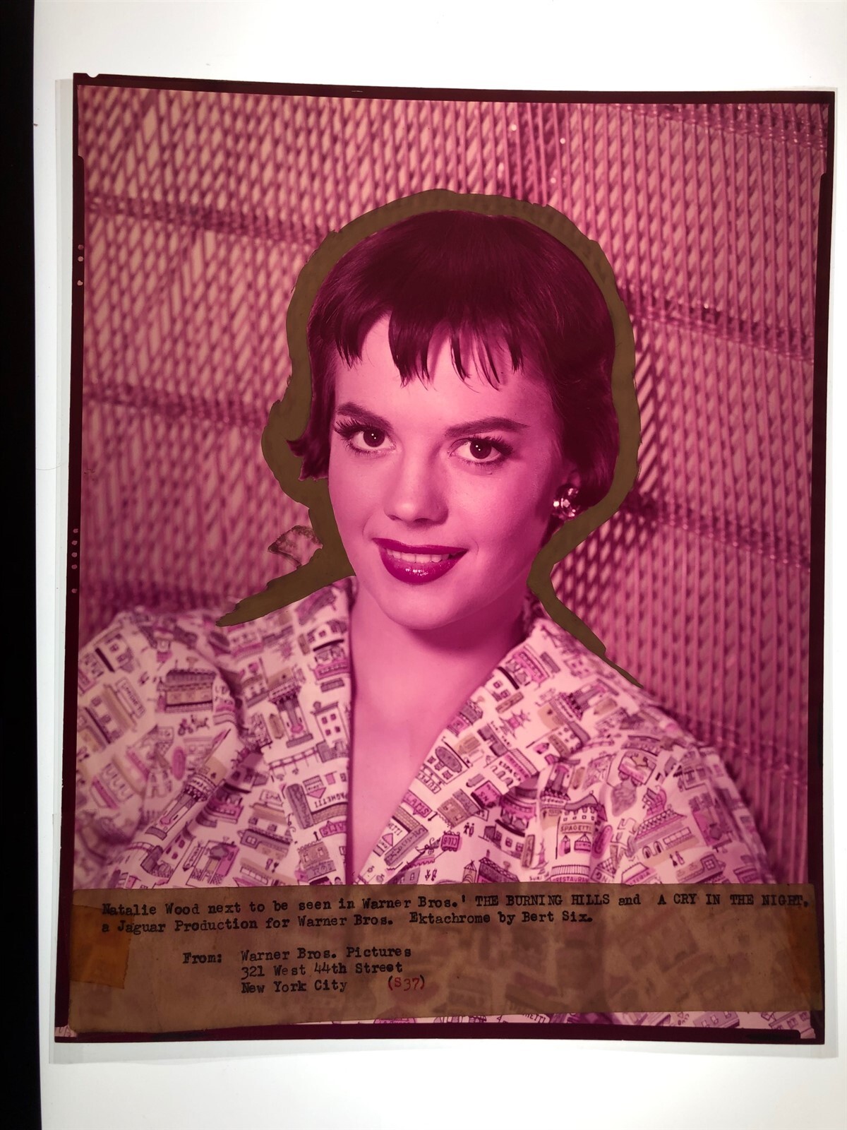 Natalie Wood Teenage Warner Bros Portrait 1956 Original 8x10 Color Transparency - rare original 8x10 inch color transparency of Natalie Wood by Bert Six with original Warner Bros credit caption to promote the teenage star in 1956. This original transparency has marker outline on film where published for magazine use. This is an original studio or photographer's 8x10 inches color transparency from our historic archive. This is a real collector's item and would make superb quality photographs or prints. This would also be a great addition to any collection or image archive. This original color transparency is in Good/VG (crop marker outline on film from publication) condition. This collector's item is being sold from one collector to another, no rights are given or implied. Silver Screen Mementos are gradually releasing from their vast archives thousands of original photographs, transparencies, negatives, slides, lobby cards and other movie or television memorabilia.