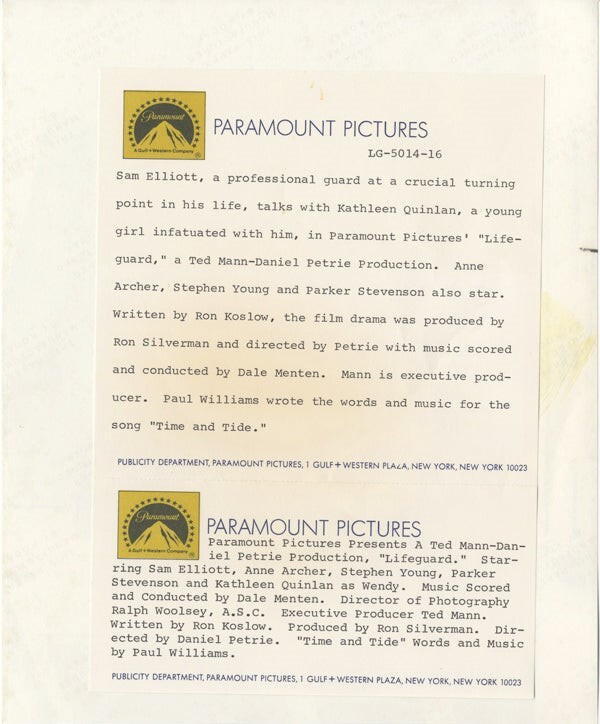 Lifeguard Sam Elliott, Kathleen Quinlan Beach Scene Original 8x10 Photo with Snipe 1975 Near Mint Condition This item is an ORIGINAL 8x10 photo from the historic archives of Silver Screen Mementos. This original photograph was made in the actual year the film, television show or event was produced. The movie studios produced publicity photographs for distribution to the press, photo agencies and publicity departments to advertise the film/tv show or event. Very often original photos have press release information on the reverse of the photo - movie credits, description of the scene, event and people involved. This is a historic piece of cinema art and is being offered from one collector to another, no rights given or implied. Silver Screen are gradually releasing thousands of Original Photographs, Transparencies, Negatives, Lobby Cards, Posters, Magazines and other memorabilia from our historic archive.
