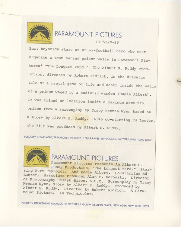 The Longest Yard Burt Reynolds Quarterback Portrait Original 8x10 Photo with Snipe 1974 Near Mint Condition This item is an ORIGINAL 8x10 photo from the historic archives of Silver Screen Mementos. This original photograph was made in the actual year the film, television show or event was produced. The movie studios produced publicity photographs for distribution to the press, photo agencies and publicity departments to advertise the film/tv show or event. Very often original photos have press release information on the reverse of the photo - movie credits, description of the scene, event and people involved. This is a historic piece of cinema art and is being offered from one collector to another, no rights given or implied. Silver Screen are gradually releasing thousands of Original Photographs, Transparencies, Negatives, Lobby Cards, Posters, Magazines and other memorabilia from our historic archive.