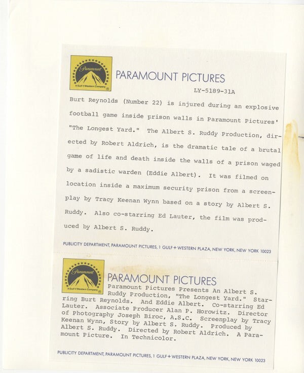 The Longest Yard Burt Reynolds Football Team Original 8x10 Photo with Snipe 1974 Near Mint Condition This item is an ORIGINAL 8x10 photo from the historic archives of Silver Screen Mementos. This original photograph was made in the actual year the film, television show or event was produced. The movie studios produced publicity photographs for distribution to the press, photo agencies and publicity departments to advertise the film/tv show or event. Very often original photos have press release information on the reverse of the photo - movie credits, description of the scene, event and people involved. This is a historic piece of cinema art and is being offered from one collector to another, no rights given or implied. Silver Screen are gradually releasing thousands of Original Photographs, Transparencies, Negatives, Lobby Cards, Posters, Magazines and other memorabilia from our historic archive.