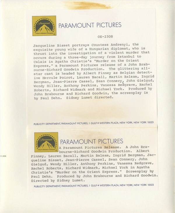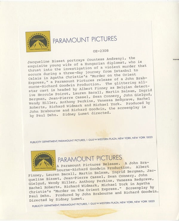 Murder on the Orient Express Jacqueline Bisset Original 8x10 Photo with Snipe 1974 Near Mint Condition This item is an ORIGINAL 8x10 photo from the historic archives of Silver Screen Mementos. This original photograph was made in the actual year the film, television show or event was produced. The movie studios produced publicity photographs for distribution to the press, photo agencies and publicity departments to advertise the film/tv show or event. Very often original photos have press release information on the reverse of the photo - movie credits, description of the scene, event and people involved. This is a historic piece of cinema art and is being offered from one collector to another, no rights given or implied. Silver Screen are gradually releasing thousands of Original Photographs, Transparencies, Negatives, Lobby Cards, Posters, Magazines and other memorabilia from our historic archive.