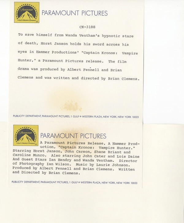 Captain Kronos Vampire Hunter Horst Janson, Wanda Ventham Hammer Horror Original 8x10 Photo with Snipe 1972 Near Mint Condition This item is an ORIGINAL 8x10 photo from the historic archives of Silver Screen Mementos. This original photograph was made in the actual year the film, television show or event was produced. The movie studios produced publicity photographs for distribution to the press, photo agencies and publicity departments to advertise the film/tv show or event. Very often original photos have press release information on the reverse of the photo - movie credits, description of the scene, event and people involved. This is a historic piece of cinema art and is being offered from one collector to another, no rights given or implied. Silver Screen are gradually releasing thousands of Original Photographs, Transparencies, Negatives, Lobby Cards, Posters, Magazines and other memorabilia from our historic archive.