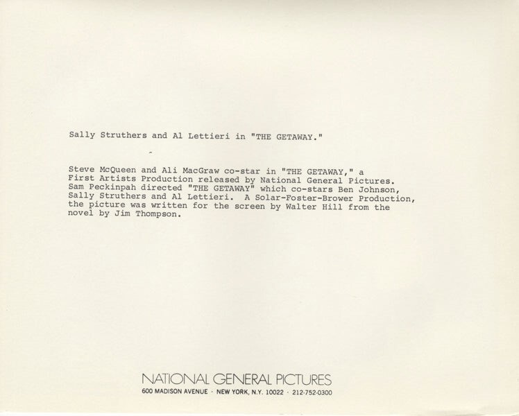 The Getaway 1972 Al Lettieri Sally Struthers Original 8x10 Photo Sam Peckinpah classic thriller - VG/Near Mnt Condition This item is an ORIGINAL 8x10 photo from the historic archives of Silver Screen Mementos. This original photograph was made in the actual year the film, television show or event was produced. The movie studios produced publicity photographs for distribution to the press, photo agencies and publicity departments to advertise the film/tv show or event. Very often original photos have press release information on the reverse of the photo - movie credits, description of the scene, event and people involved. This is a historic piece of cinema art and is being offered from one collector to another, no rights given or implied. Silver Screen are gradually releasing thousands of Original Photographs, Transparencies, Negatives, Lobby Cards, Posters, Magazines and other memorabilia from our historic archive.