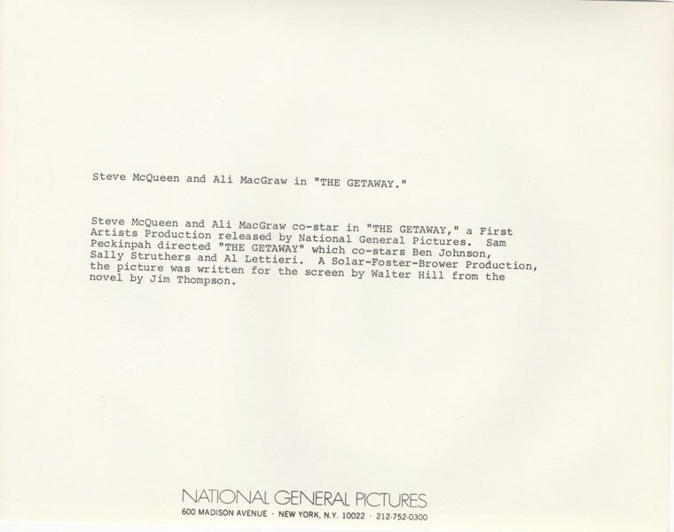 The Getaway Steve McQueen Ali MacGraw in bed Original 8x10 Photo 1972 Stamped Near Mint Condition This item is an ORIGINAL 8x10 photo from the historic archives of Silver Screen Mementos. This original photograph was made in the actual year the film, television show or event was produced. The movie studios produced publicity photographs for distribution to the press, photo agencies and publicity departments to advertise the film/tv show or event. Very often original photos have press release information on the reverse of the photo - movie credits, description of the scene, event and people involved. This is a historic piece of cinema art and is being offered from one collector to another, no rights given or implied. Silver Screen are gradually releasing thousands of Original Photographs, Transparencies, Negatives, Lobby Cards, Posters, Magazines and other memorabilia from our historic archive.