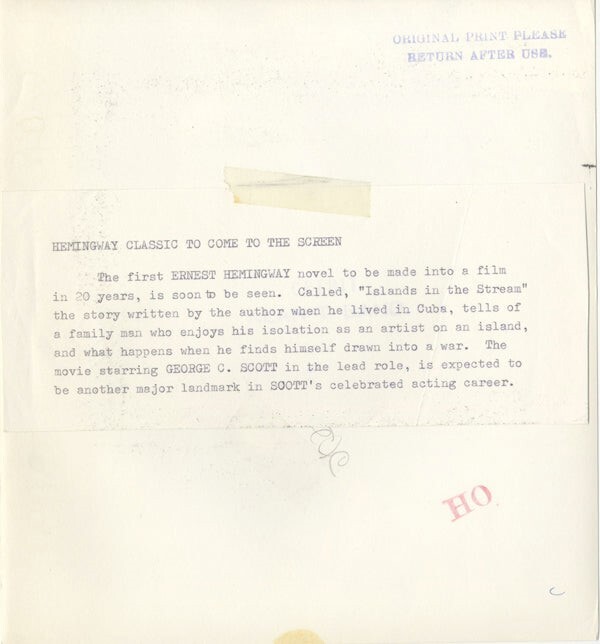 George C. Scott portrait Islands in the Stream 1977 Original Photo with snipe VG Condition (border trim) This item is an ORIGINAL 8x10 photo from the historic archives of Silver Screen Mementos. This original photograph was made in the actual year the film, television show or event was produced. The movie studios produced publicity photographs for distribution to the press, photo agencies and publicity departments to advertise the film/tv show or event. Very often original photos have press release information on the reverse of the photo - movie credits, description of the scene, event and people involved. This is a historic piece of cinema art and is being offered from one collector to another, no rights given or implied. Silver Screen are gradually releasing thousands of Original Photographs, Transparencies, Negatives, Lobby Cards, Posters, Magazines and other memorabilia from our historic archive.