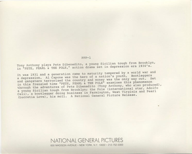 Tony Anthony gangster machine gun Pete Pearl & The Pole Original 8x10 Photo 1973 VG/Near Mint This item is an ORIGINAL 8x10 photo from the historic archives of Silver Screen Mementos. This original photograph was made in the actual year the film, television show or event was produced. The movie studios produced publicity photographs for distribution to the press, photo agencies and publicity departments to advertise the film/tv show or event. Very often original photos have press release information on the reverse of the photo - movie credits, description of the scene, event and people involved. This is a historic piece of cinema art and is being offered from one collector to another, no rights given or implied. Silver Screen are gradually releasing thousands of Original Photographs, Transparencies, Negatives, Lobby Cards, Posters, Magazines and other memorabilia from our historic archive.