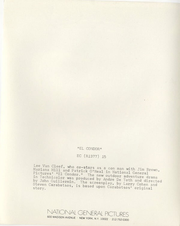 Lee Van Cleef iconic porrait western El Condor 1970 Original 8x10 Photo with snipe VG/Near Mint This item is an ORIGINAL 8x10 photo from the historic archives of Silver Screen Mementos. This original photograph was made in the actual year the film, television show or event was produced. The movie studios produced publicity photographs for distribution to the press, photo agencies and publicity departments to advertise the film/tv show or event. Very often original photos have press release information on the reverse of the photo - movie credits, description of the scene, event and people involved. This is a historic piece of cinema art and is being offered from one collector to another, no rights given or implied. Silver Screen are gradually releasing thousands of Original Photographs, Transparencies, Negatives, Lobby Cards, Posters, Magazines and other memorabilia from our historic archive.