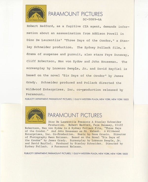 Robert Redford Three Days of the Condor Holding Gun Original 8x10 Photo 1975 with Snipe Near Mint Condition This item is an ORIGINAL 8x10 photo from the historic archives of Silver Screen Mementos. This original photograph was made in the actual year the film, television show or event was produced. The movie studios produced publicity photographs for distribution to the press, photo agencies and publicity departments to advertise the film/tv show or event. Very often original photos have press release information on the reverse of the photo - movie credits, description of the scene, event and people involved. This is a historic piece of cinema art and is being offered from one collector to another, no rights given or implied. Silver Screen are gradually releasing thousands of Original Photographs, Transparencies, Negatives, Lobby Cards, Posters, Magazines and other memorabilia from our historic archive.