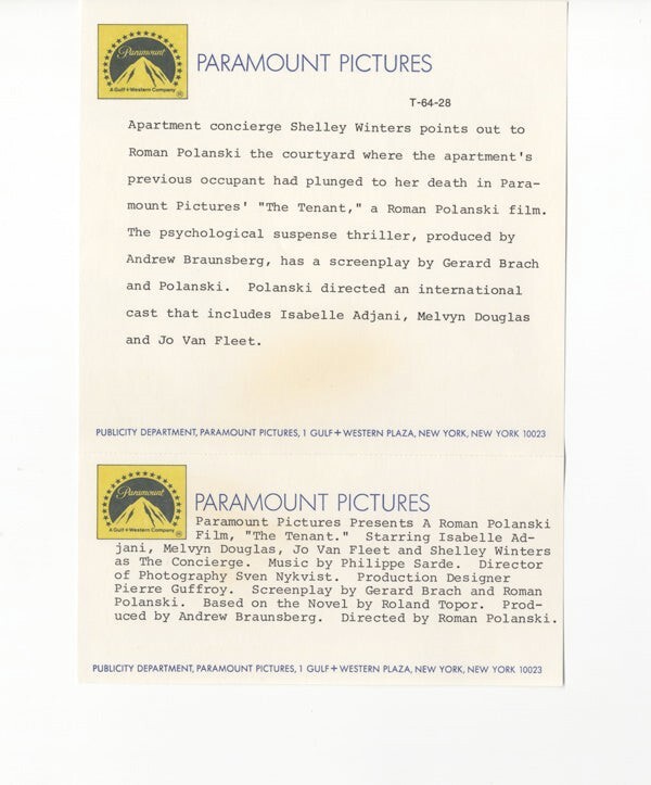The Tenant Shelley Winters, Roman Polanski Original 8x10 Photo with Snipe 1976 Good/VG Condition (vertical crease left side) This item is an ORIGINAL 8x10 photo from the historic archives of Silver Screen Mementos. This original photograph was made in the actual year the film, television show or event was produced. The movie studios produced publicity photographs for distribution to the press, photo agencies and publicity departments to advertise the film/tv show or event. Very often original photos have press release information on the reverse of the photo - movie credits, description of the scene, event and people involved. This is a historic piece of cinema art and is being offered from one collector to another, no rights given or implied. Silver Screen are gradually releasing thousands of Original Photographs, Transparencies, Negatives, Lobby Cards, Posters, Magazines and other memorabilia from our historic archive.