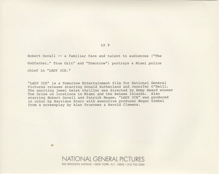 Robert Duvall portrait Lady Ice Original 8x10 Photo This item is an ORIGINAL 8x10 photo from the historic archives of Silver Screen Mementos. This original photograph was made in the actual year the film, television show or event was produced. The movie studios produced publicity photographs for distribution to the press, photo agencies and publicity departments to advertise the film/tv show or event. Very often original photos have press release information on the reverse of the photo - movie credits, description of the scene, event and people involved. This is a historic piece of cinema art and is being offered from one collector to another, no rights given or implied. Silver Screen are gradually releasing thousands of Original Photographs, Transparencies, Negatives, Lobby Cards, Posters, Magazines and other memorabilia from our historic archive.