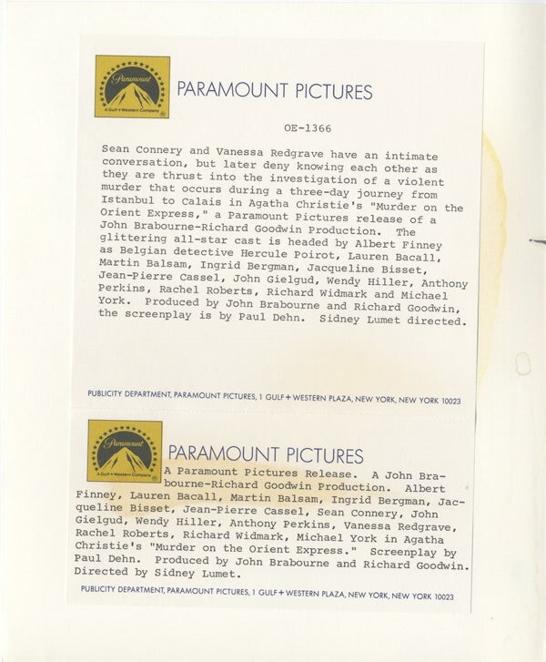 Murder on the Orient Express Sean Connery Vanessa Redgrave Original 8x10 Photo with paper caption snipe Near Mint Condition This item is an ORIGINAL 8x10 photo from the historic archives of Silver Screen Mementos. This original photograph was made in the actual year the film, television show or event was produced. The movie studios produced publicity photographs for distribution to the press, photo agencies and publicity departments to advertise the film/tv show or event. Very often original photos have press release information on the reverse of the photo - movie credits, description of the scene, event and people involved. This is a historic piece of cinema art and is being offered from one collector to another, no rights given or implied. Silver Screen are gradually releasing thousands of Original Photographs, Transparencies, Negatives, Lobby Cards, Posters, Magazines and other memorabilia from our historic archive.