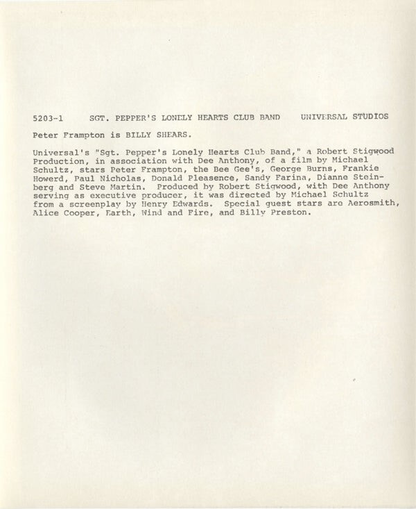Peter Frampton Sgt. Pepper's Lonely Hearts Club Original 8x10 Photo with snipe Near Mint Condition This item is an ORIGINAL 8x10 photo from the historic archives of Silver Screen Mementos. This original photograph was made in the actual year the film, television show or event was produced. The movie studios produced publicity photographs for distribution to the press, photo agencies and publicity departments to advertise the film/tv show or event. Very often original photos have press release information on the reverse of the photo - movie credits, description of the scene, event and people involved. This is a historic piece of cinema art and is being offered from one collector to another, no rights given or implied. Silver Screen are gradually releasing thousands of Original Photographs, Transparencies, Negatives, Lobby Cards, Posters, Magazines and other memorabilia from our historic archive.