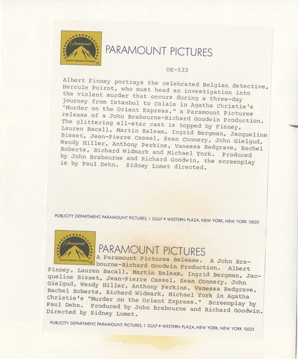 Murder on the Orient Express Albert Finney Hercule Poirot Original 8x10 Photo with paper caption snipe Near Mint Condition This item is an ORIGINAL 8x10 photo from the historic archives of Silver Screen Mementos. This original photograph was made in the actual year the film, television show or event was produced. The movie studios produced publicity photographs for distribution to the press, photo agencies and publicity departments to advertise the film/tv show or event. Very often original photos have press release information on the reverse of the photo - movie credits, description of the scene, event and people involved. This is a historic piece of cinema art and is being offered from one collector to another, no rights given or implied. Silver Screen are gradually releasing thousands of Original Photographs, Transparencies, Negatives, Lobby Cards, Posters, Magazines and other memorabilia from our historic archive.