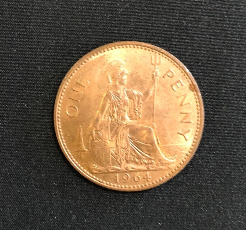 The 1964 one penny coin from Great Britain features a bust of Queen Elizabeth II facing to the right on the obverse side. The bust is surrounded by the words "ELIZABETH II DEI GRATIA REGINA," which translates to "Elizabeth II, by the grace of God, Queen."On the reverse side, the coin shows a seated Britannia, the allegorical figure of Great Britain, holding a trident and shield with a lion at her feet. Surrounding the image are the words "ONE PENNY," along with the date "1964" below Britannia's image.The coin is made of bronze and has a diameter of 30.8mm. It weighs 9.45 grams and has a thickness of 1.7mm. The edge of the coin is smooth and plain.The design of the 1964 one penny coin from Great Britain is a continuation of the classic design that was introduced in 1937, and it remained in circulation until decimalization in 1971. It is a popular choice among collectors of British coins due to its historical significance and beautiful design.
