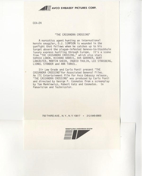 O.J. Simpson holding gun The Cassandra Crossing 1976 Original 8x10 Photo Near Mint Condition This item is an ORIGINAL 8x10 photo from the historic archives of Silver Screen Mementos. This original photograph was made in the actual year the film, television show or event was produced. The movie studios produced publicity photographs for distribution to the press, photo agencies and publicity departments to advertise the film/tv show or event. Very often original photos have press release information on the reverse of the photo - movie credits, description of the scene, event and people involved. This is a historic piece of cinema art and is being offered from one collector to another, no rights given or implied. Silver Screen are gradually releasing thousands of Original Photographs, Transparencies, Negatives, Lobby Cards, Posters, Magazines and other memorabilia from our historic archive.