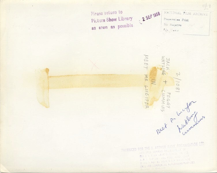 Meet Mr Lucifer 1953 Jack Watling Peggy Cummins Stamped Original 8x10 Photo VG/Near Mint Condition This item is an ORIGINAL 8x10 photo from the historic archives of Silver Screen Mementos. This original photograph was made in the actual year the film, television show or event was produced. The movie studios produced publicity photographs for distribution to the press, photo agencies and publicity departments to advertise the film/tv show or event. Very often original photos have press release information on the reverse of the photo - movie credits, description of the scene, event and people involved. This is a historic piece of cinema art and is being offered from one collector to another, no rights given or implied. Silver Screen are gradually releasing thousands of Original Photographs, Transparencies, Negatives, Lobby Cards, Posters, Magazines and other memorabilia from our historic archive.