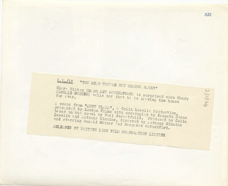 Aunt Clara 1954 Margaret Rutherford Ronald Shiner Original 8x10 Photo with snipe VG/Near Mint Condition This item is an ORIGINAL 8x10 photo from the historic archives of Silver Screen Mementos. This original photograph was made in the actual year the film, television show or event was produced. The movie studios produced publicity photographs for distribution to the press, photo agencies and publicity departments to advertise the film/tv show or event. Very often original photos have press release information on the reverse of the photo - movie credits, description of the scene, event and people involved. This is a historic piece of cinema art and is being offered from one collector to another, no rights given or implied. Silver Screen are gradually releasing thousands of Original Photographs, Transparencies, Negatives, Lobby Cards, Posters, Magazines and other memorabilia from our historic archive.