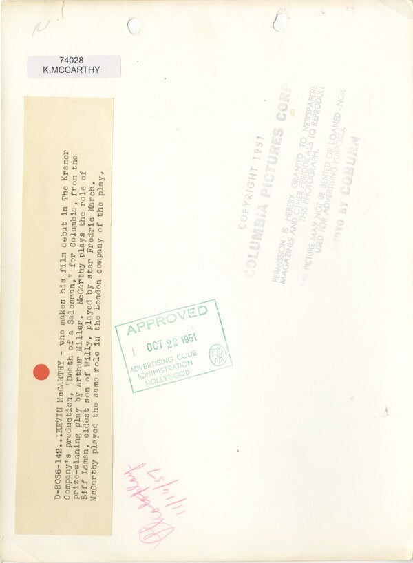 Kevin McCarthy 1951 Double Weight Silver Gelatin Original Photo by Robert Coburn - wonderful key book photo measuring approx 8x12 inches of the classic character actor for his movie debut in 'Death of A Salesman' stamped 1951. VG/Near Mint Condition This item is an ORIGINAL 8x10 photo from the historic archives of Silver Screen Mementos. This original photograph was made in the actual year the film, television show or event was produced. The movie studios produced publicity photographs for distribution to the press, photo agencies and publicity departments to advertise the film/tv show or event. Very often original photos have press release information on the reverse of the photo - movie credits, description of the scene, event and people involved. This is a historic piece of cinema art and is being offered from one collector to another, no rights given or implied. Silver Screen are gradually releasing thousands of Original Photographs, Transparencies, Negatives, Lobby Cards, Posters, Magazines and other memorabilia from our historic archive.