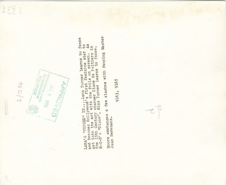 Diane 1955 Roger Moore fencing lesson Jean Heremans Original Double Weight Silver Gelatin Stamped 8x10 Photo VG/Near Mint This item is an ORIGINAL 8x10 photo from the historic archives of Silver Screen Mementos. This original photograph was made in the actual year the film, television show or event was produced. The movie studios produced publicity photographs for distribution to the press, photo agencies and publicity departments to advertise the film/tv show or event. Very often original photos have press release information on the reverse of the photo - movie credits, description of the scene, event and people involved. This is a historic piece of cinema art and is being offered from one collector to another, no rights given or implied. Silver Screen are gradually releasing thousands of Original Photographs, Transparencies, Negatives, Lobby Cards, Posters, Magazines and other memorabilia from our historic archive.