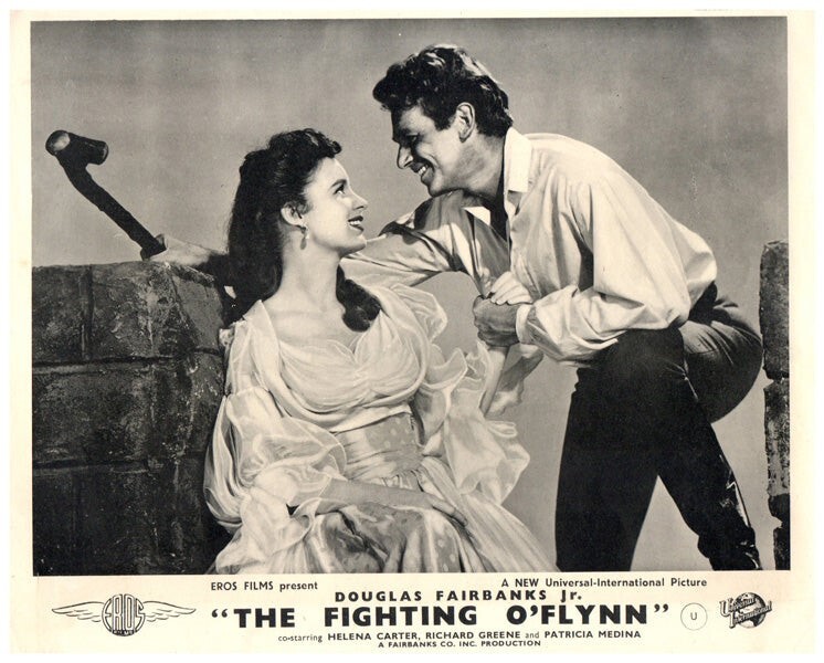 The Fighting O'Flynn 1949 Original British Front of House Lobby Card Douglas Fairbanks Jr., Helena Carter, Richard Greene and Patricia Medina - VG Condition Silver Screen Mementos are pleased to be able to offer this authentic original Lobby Card measuring 8x10 inches. This lobby card is from Great Britain and was printed during the actual year the film was released in movie theaters. The lobby card (also known as Front of House/ FOH card in the UK) was created by the film studios to publicize the movie and was intended for display outside the movie theatre in special glass display boxes. These are NOT reproductions! You are looking at a truly original piece of cinema art, a genuine collector's item. We have a huge archive of over 250,000 original lobby cards, mostly from the 1930's to the 1980's. We will be releasing many more rare gems from our vast collection, which will include lobby cards, original photographs, movie stills, magazines, brochures negatives, transparencies, slides and other collectible items of movie memorabilia.