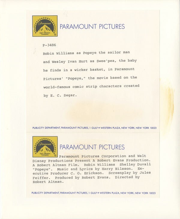 Popeye 1980 Robert Altman film Robin Williams Swee pea Original 8x10 Photo with paper caption snipe in VG/Near Mint Condition The 1980 film "Popeye" is a musical comedy directed by Robert Altman and based on the beloved comic strip character created by E.C. Segar. Starring Robin Williams in the titular role, the film follows Popeye's adventures as he arrives in the fictional town of Sweethaven in search of his long-lost father. Along the way, he encounters a colorful cast of characters, including Olive Oyl, played by Shelley Duvall. The movie is known for its whimsical atmosphere, quirky humor, and memorable musical numbers. "Popeye" has gained a cult following and remains a nostalgic favorite for many. This item is an ORIGINAL 8x10 photo from the historic archives of Silver Screen Mementos. This original photograph was made in the actual year the film, television show or event was produced. The movie studios produced publicity photographs for distribution to the press, photo agencies and publicity departments to advertise the film/tv show or event. Very often original photos have press release information on the reverse of the photo - movie credits, description of the scene, event and people involved. This is a historic piece of cinema art and is being offered from one collector to another, no rights given or implied. Silver Screen are gradually releasing thousands of Original Photographs, Transparencies, Negatives, Lobby Cards, Posters, Magazines and other memorabilia from our historic archive.