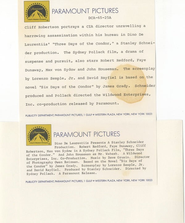 Three Days of the Condor 1975 Cliff Robertson Original 8x10 Photo with paper caption snipe in Near Mint Condition This item is an ORIGINAL 8x10 photo from the historic archives of Silver Screen Mementos. This original photograph was made in the actual year the film, television show or event was produced. The movie studios produced publicity photographs for distribution to the press, photo agencies and publicity departments to advertise the film/tv show or event. Very often original photos have press release information on the reverse of the photo - movie credits, description of the scene, event and people involved. This is a historic piece of cinema art and is being offered from one collector to another, no rights given or implied. Silver Screen are gradually releasing thousands of Original Photographs, Transparencies, Negatives, Lobby Cards, Posters, Magazines and other memorabilia from our historic archive.