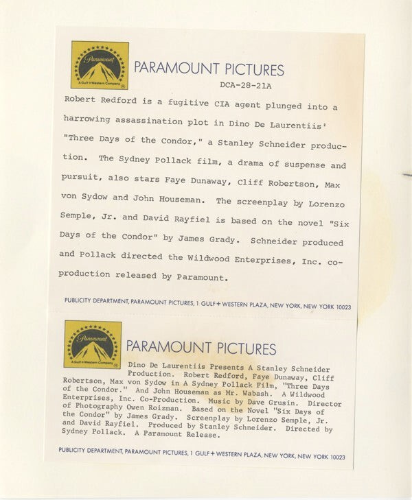 Three Days of the Condor 1975 Robert Redford Original 8x10 Photo with paper caption snipe in Near Mint Condition This item is an ORIGINAL 8x10 photo from the historic archives of Silver Screen Mementos. This original photograph was made in the actual year the film, television show or event was produced. The movie studios produced publicity photographs for distribution to the press, photo agencies and publicity departments to advertise the film/tv show or event. Very often original photos have press release information on the reverse of the photo - movie credits, description of the scene, event and people involved. This is a historic piece of cinema art and is being offered from one collector to another, no rights given or implied. Silver Screen are gradually releasing thousands of Original Photographs, Transparencies, Negatives, Lobby Cards, Posters, Magazines and other memorabilia from our historic archive.