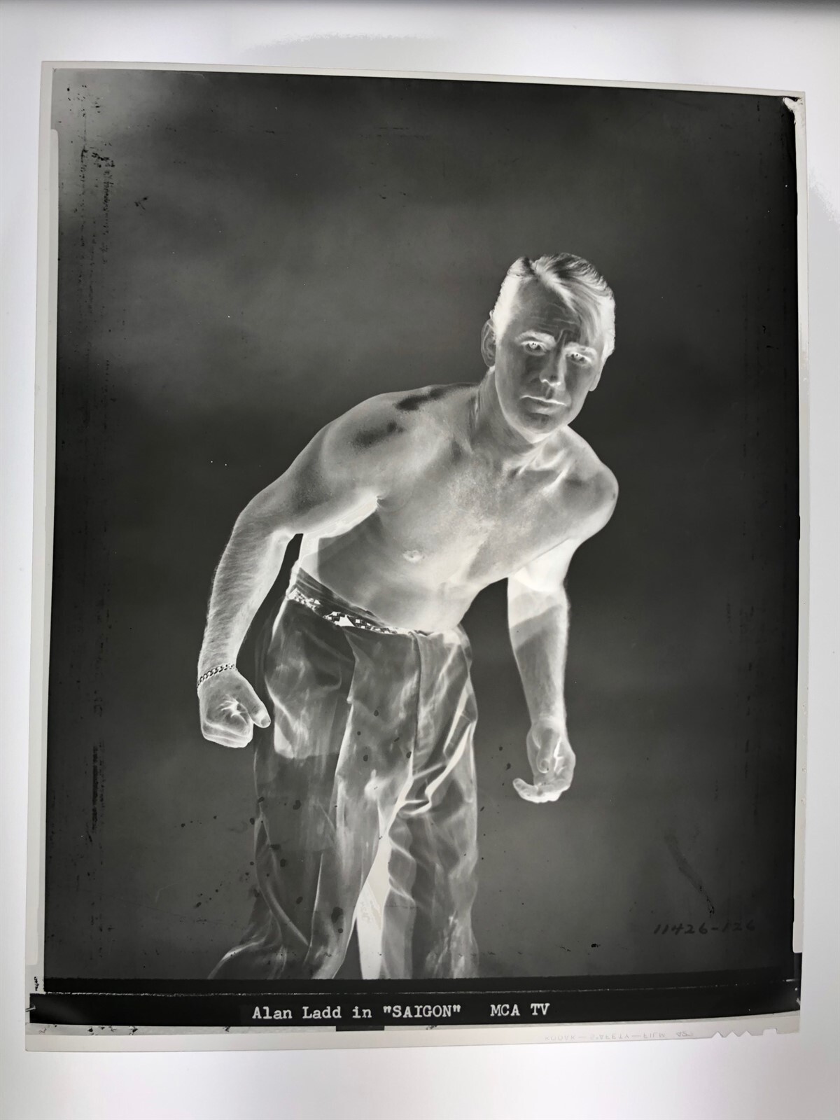 Alan Ladd barechested beefcake portrait Vintage MCA TV release 8x10 Negative - great portrait of the legendary star. This is an original studio or photographer's 8x10 inches black and white photographic negative from our historic archive. This is a real collector's item and would make superb quality photographs or prints. This would also be a great addition to any collection or image archive. This original black and white photographic negative is in Excellent condition. This collector's item is being sold from one collector to another, no rights are given or implied. Silver Screen Mementos are gradually releasing from their vast archives thousands of original photographs, transparencies, negatives, slides, lobby cards and other movie or television memorabilia.