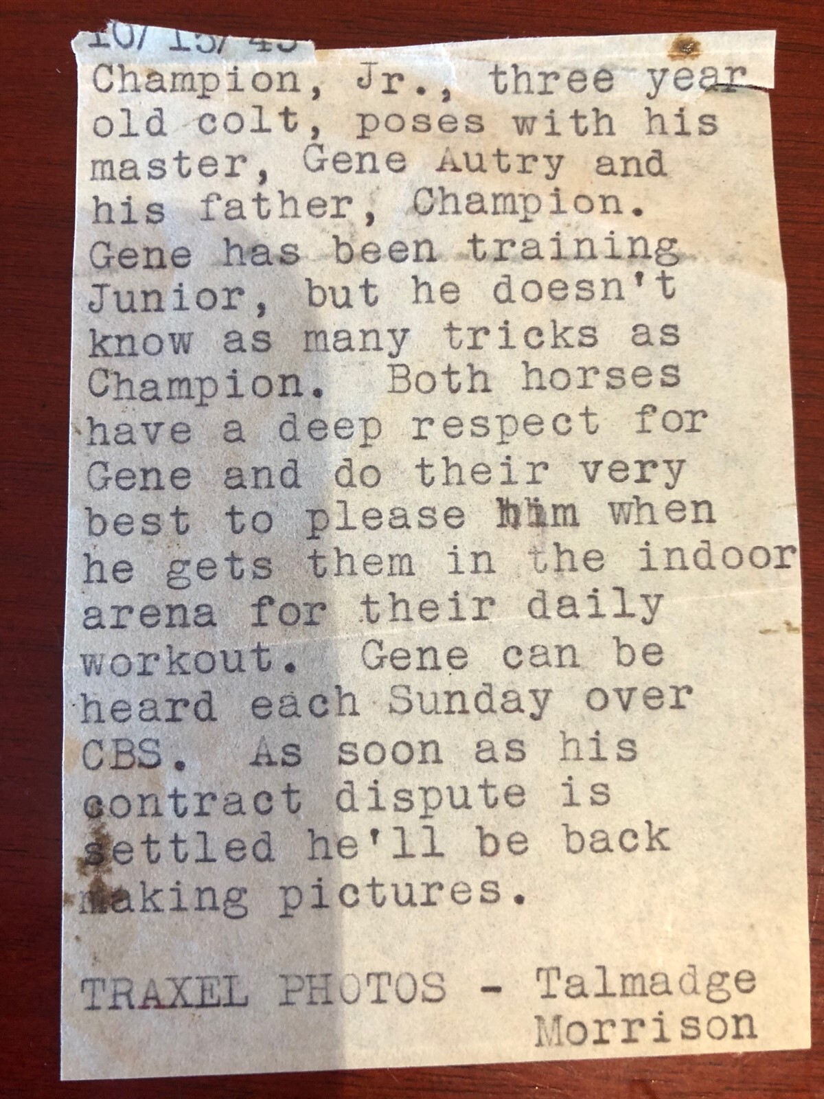 Gene Autry Champion the Wonder Horse photo shoot 1945 Original 5x4 Transparency with paper caption snipeThis is an original studio or photographer's 4x5 inches color slide transparency from our historic archive. This is a real collector's item and would make superb quality photographs or prints. This would also be a great addition to any collection or image archive. This original color slide transparency is in Excellent condition. This collector's item is being sold from one collector to another, no rights are given or implied. Silver Screen Mementos are gradually releasing from their vast archives thousands of original photographs, transparencies, negatives, slides, lobby cards and other movie or television memorabilia.