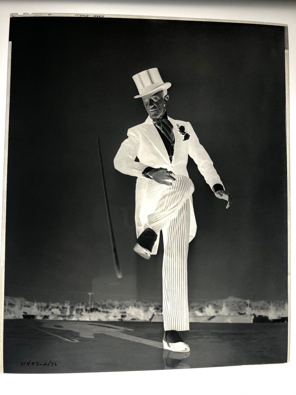 Fred Astaire 1946 Los Angeles Skyline Blue Skies Original 8x10 Camera Negative - an absolutely wonderful original 8x10 nitrate camera negative with hand applied India ink code and retouched highlights. This is an iconic image of Fred Astaire dressed in top hat, tails and tap shoes posing against Los Angeles skyline for a publicity portrait for the 1946 Musical 'Blue Skies'. A real treasure beng released from our historic archives. This is an original studio or photographer's 8x10 inches black and white photographic negative from our historic archive. This is a real collector's item and would make superb quality photographs or prints. This would also be a great addition to any collection or image archive. This original black and white photographic negative is in Excellent condition. This collector's item is being sold from one collector to another, no rights are given or implied. Silver Screen Mementos are gradually releasing from their vast archives thousands of original photographs, transparencies, negatives, slides, lobby cards and other movie or television memorabilia.