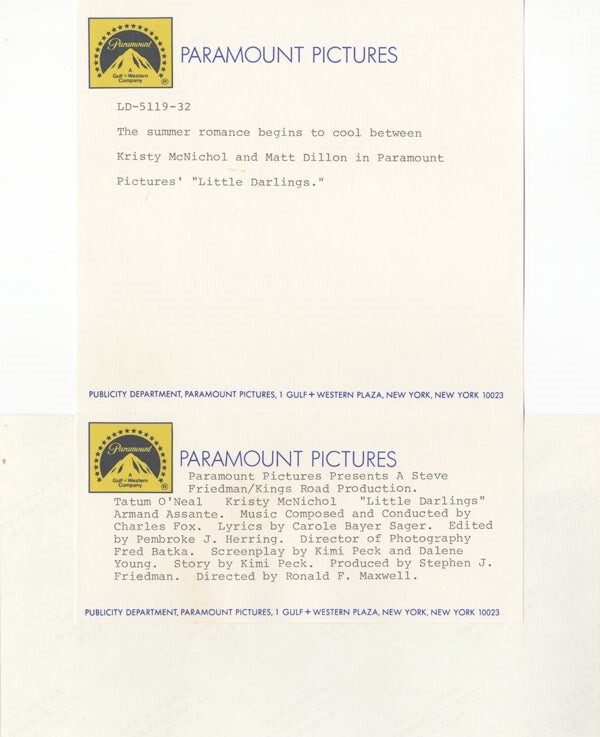 Little Darlings 1980 Matt Dillon Kristy McNicol Original 8x10 Photo with paper caption snipe - Near Mint Condition This item is an ORIGINAL 8x10 photo from the historic archives of Silver Screen Mementos. This original photograph was made in the actual year the film, television show or event was produced. The movie studios produced publicity photographs for distribution to the press, photo agencies and publicity departments to advertise the film/tv show or event. Very often original photos have press release information on the reverse of the photo - movie credits, description of the scene, event and people involved. This is a historic piece of cinema art and is being offered from one collector to another, no rights given or implied. Silver Screen are gradually releasing thousands of Original Photographs, Transparencies, Negatives, Lobby Cards, Posters, Magazines and other memorabilia from our historic archive.
