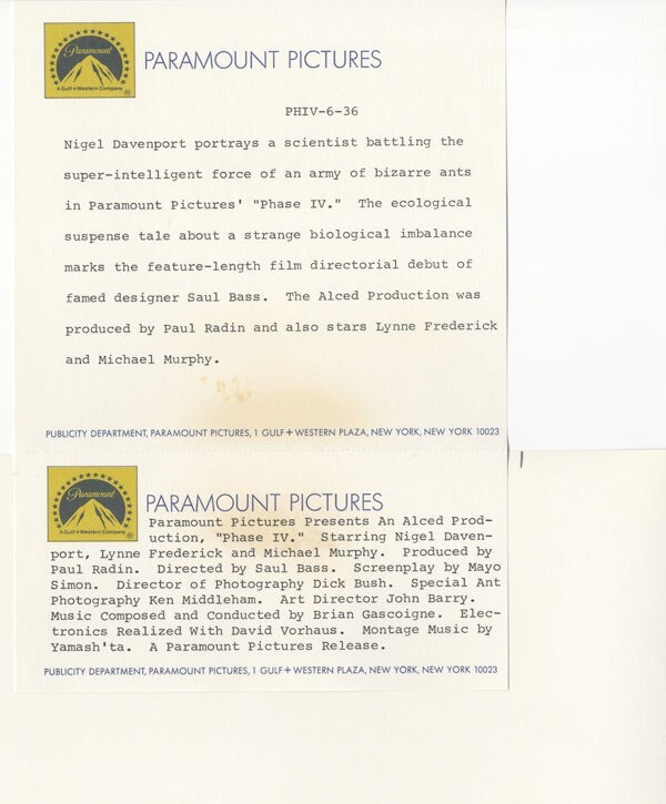 Phase IV 4 Nigel Davenport ant cult sci-fi 1973 Original 8x10 Photo with snipe directed by Saul Bass- Near Mint This item is an ORIGINAL 8x10 photo from the historic archives of Silver Screen Mementos. This original photograph was made in the actual year the film, television show or event was produced. The movie studios produced publicity photographs for distribution to the press, photo agencies and publicity departments to advertise the film/tv show or event. Very often original photos have press release information on the reverse of the photo - movie credits, description of the scene, event and people involved. This is a historic piece of cinema art and is being offered from one collector to another, no rights given or implied. Silver Screen are gradually releasing thousands of Original Photographs, Transparencies, Negatives, Lobby Cards, Posters, Magazines and other memorabilia from our historic archive.