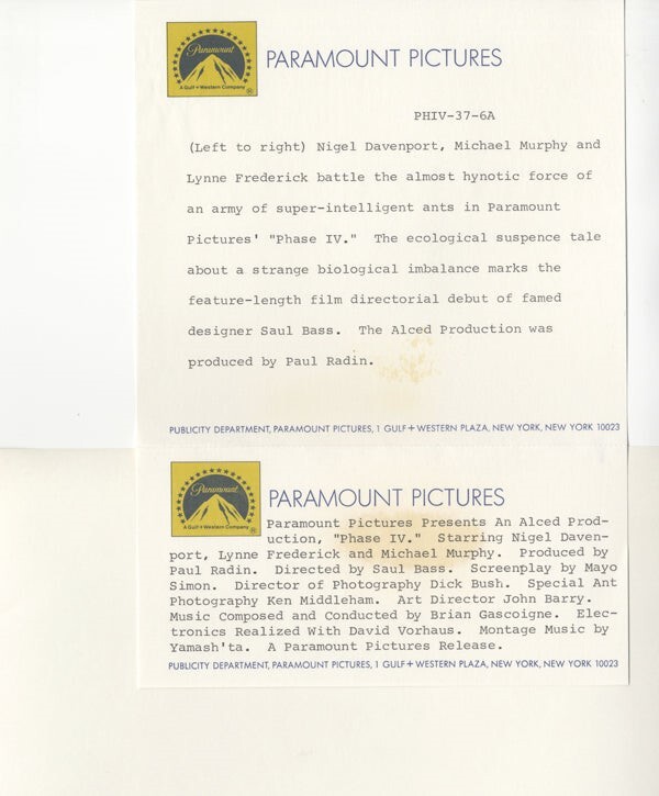 Phase IV 4 Nigel Davenport Lynne Frederick Michael Murphy 1973 Original 8x10 Photo with snipe This item is an ORIGINAL 8x10 photo from the historic archives of Silver Screen Mementos. This original photograph was made in the actual year the film, television show or event was produced. The movie studios produced publicity photographs for distribution to the press, photo agencies and publicity departments to advertise the film/tv show or event. Very often original photos have press release information on the reverse of the photo - movie credits, description of the scene, event and people involved. This is a historic piece of cinema art and is being offered from one collector to another, no rights given or implied. Silver Screen are gradually releasing thousands of Original Photographs, Transparencies, Negatives, Lobby Cards, Posters, Magazines and other memorabilia from our historic archive.